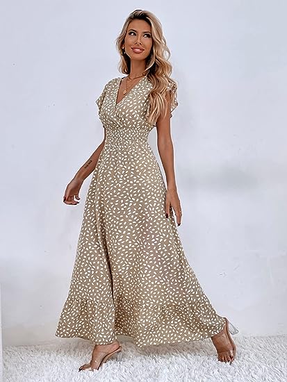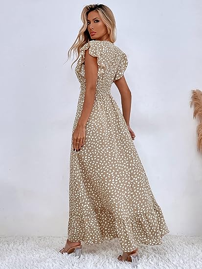Women's Allover Print Ruffle Sleeve V Neck Ruffle Hem A Line Summer Maxi Dress