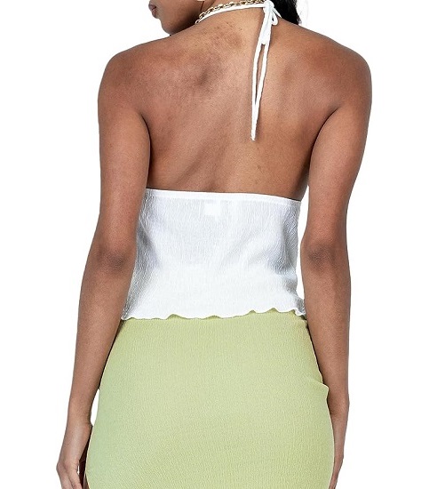 Design: Summer satin halter top, solid color, backless, crop halter top, tie front tops for women, lettuce trim, summer sleeveless halter tops, casual crop tops, stylish yet comfortable streetwear, a must have in your wardrobe.